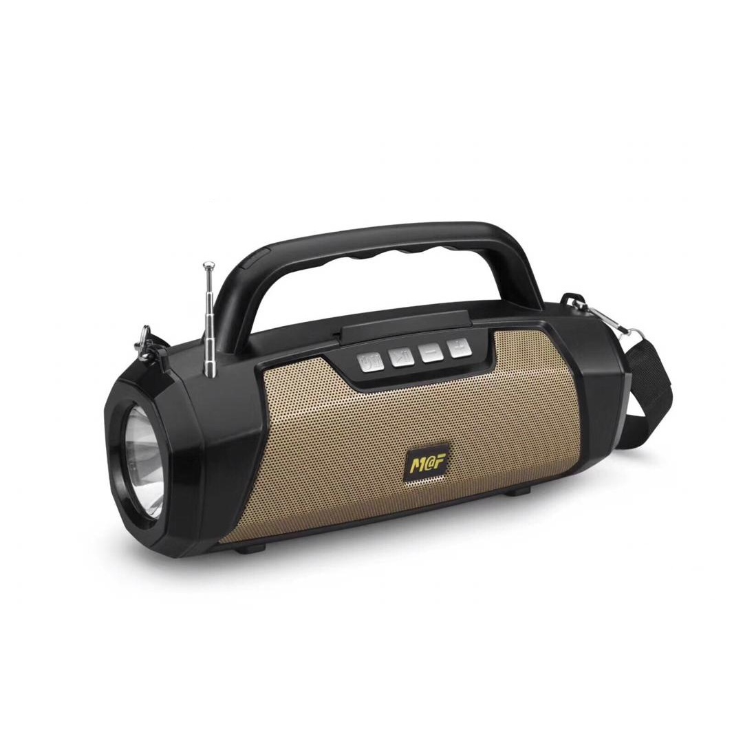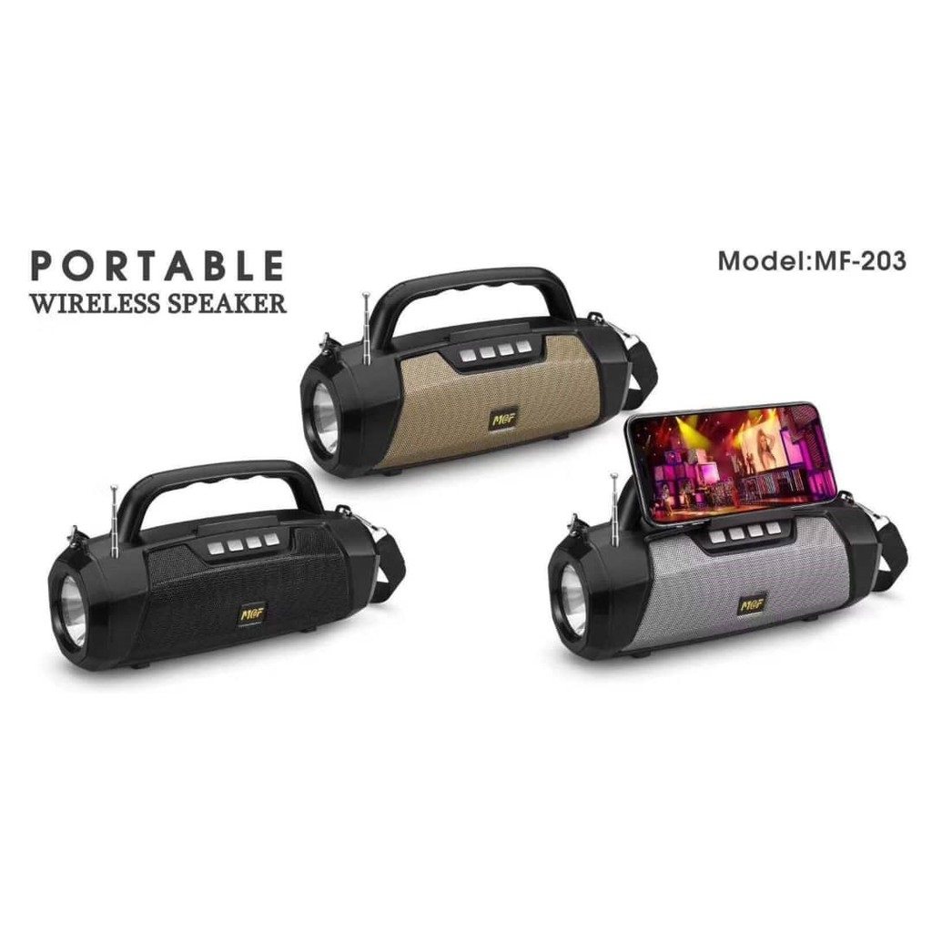 اسپیکر بلوتوثی مدل MF-203 به عنوان یکی از بهترین اسپیکرهای قابل حمل می باشد که هم می تواند به صورت بی سیم از طریق بلوتوث ورژن 4.1 و هم از طریق سیم توسط کابل صوتی AUX موجود بر روی دستگاه , موسیقی خود را پخش و گوش کنید. اسپیکر پرتابل Portable Speaker MF-203 با توان خروجی 10 وات صدایی شفاف و با کیفیت را ارائه می دهد. از ویژگی های خوب این اسپیکر قابل حمل می توان به متصل شدن از طریق شیار کارت حافظه و پورت USB به پلیر مد نظرتان اشاره کرد. ساختار اسپیکر بلوتوثی ترکیبی از جنس سیلیکون و فلز استفاده شده که باعث مقاومت بسیار در افتادن و ضربه شده است و همچنین با ابعاد و وزن استاندارد طراحی شده که کمک زیادی به راحت جابه جا کردنش کرده است. اسپیکر پرتابل Portable Speaker MF-203 دارای یک چراغ قوه با قدرت نیز بوده که محبوبیت این اسپیکر بلوتوثی را بیشتر می کند. این اسپیکر قابل شارژ با باتری قدرتمند 1200mAh خود امکان پخش موسیقی به مدت 2 ساعت را برای شما فراهم میکند. روی اسپیکر پرتابل Portable Speaker MF-203 ، پنل کنترلی کاملی وجود دارد و میتوان انواع تنظیمات را با استفاده از آن اسپیکر انجام داد. این محصول همچنین از رادیو FM پشتیبانی میکند و نیاز شما را به رادیو بر طرف می سازد.